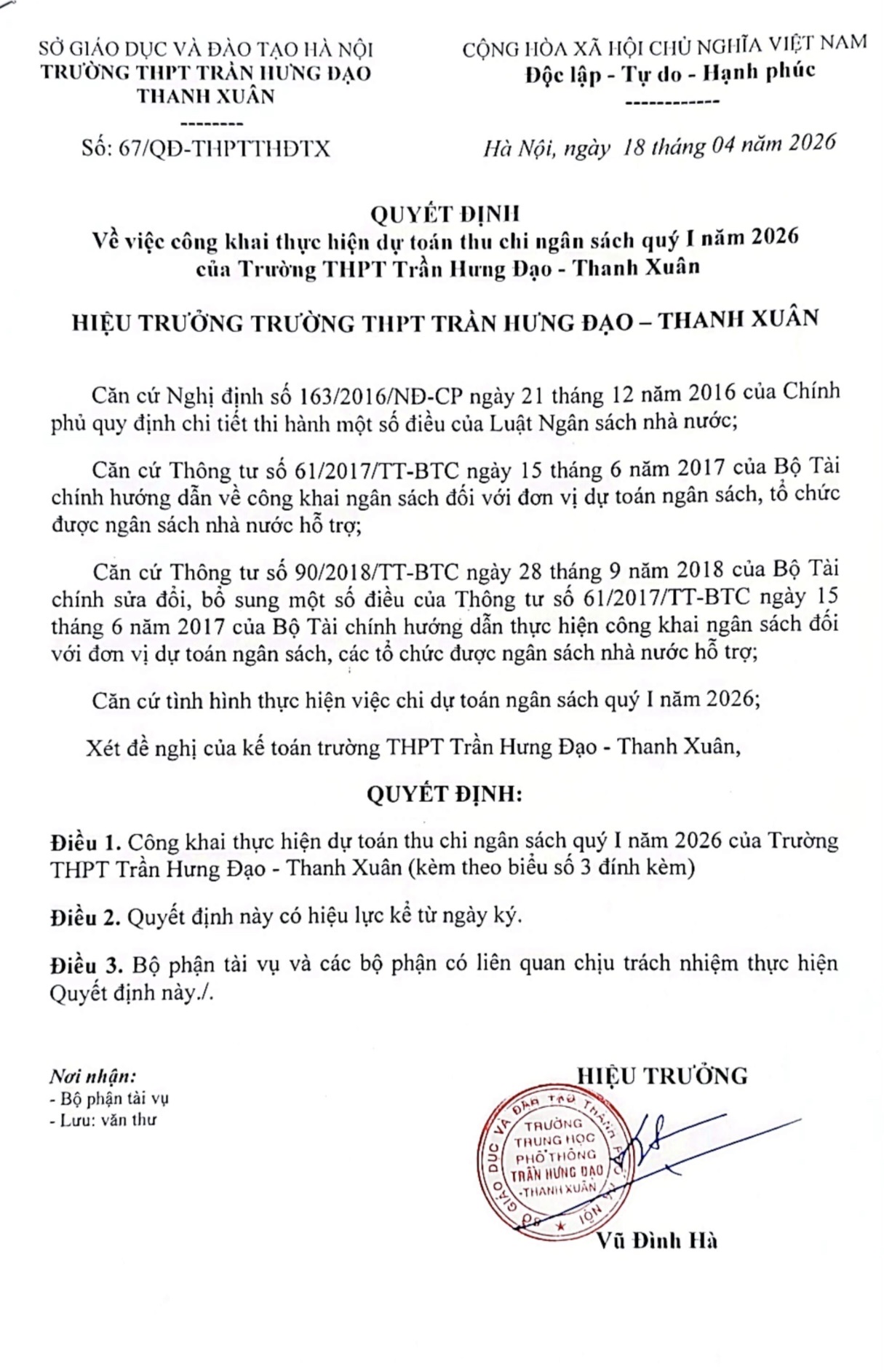 QUYẾT ĐỊNH: Công khai dự toán chi ngân sách nhà nước năm 2026 của Trường THPT Trần Hưng Đạo - Thanh Xuân