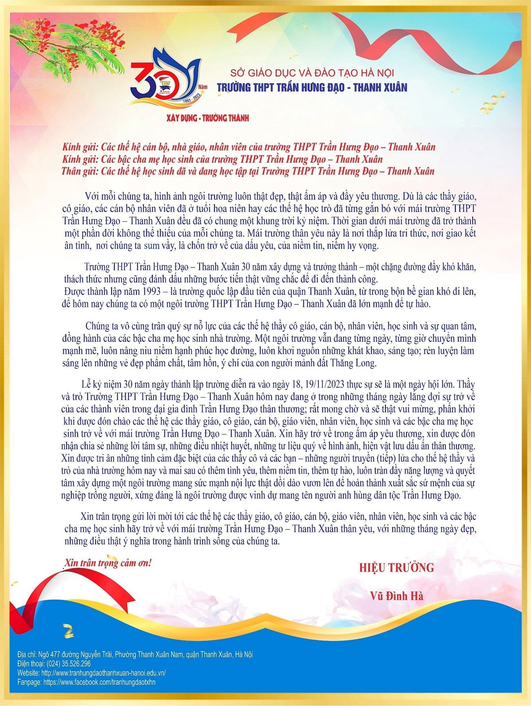 GIẤY MỜI DỰ LỄ KỶ NIỆM 30 NĂM THÀNH LẬP TRƯỜNG THPT TRẦN HƯNG ĐẠO - THANH XUÂN (1993 - 2023)