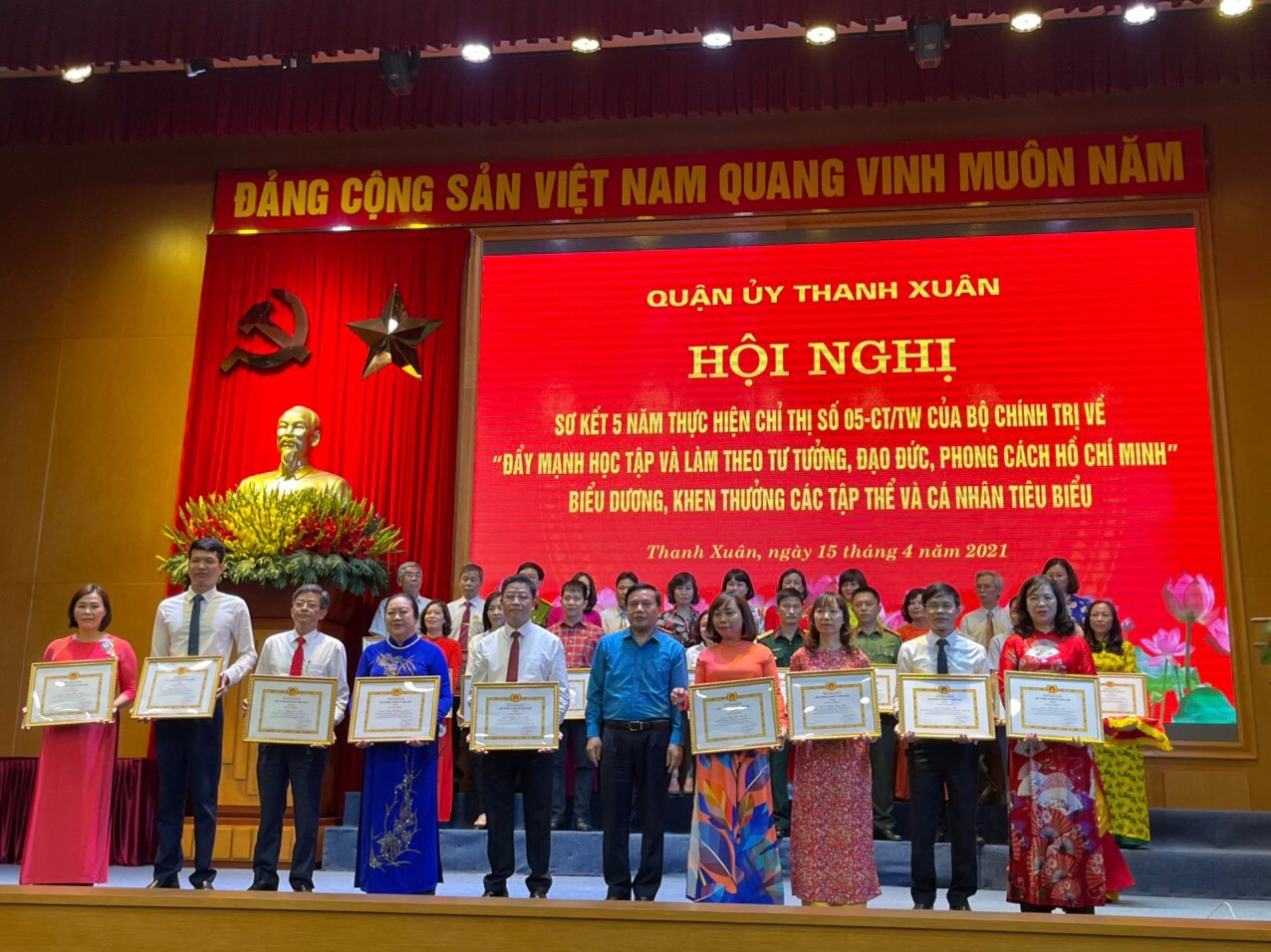 BIỂU DƯƠNG KHEN THƯỞNG CÁC TẬP THỂ, CÁ NHÂN TIÊU BIỂU TRONG THỰC HIỆN CHỈ THỊ 05-CT/TW CỦA BỘ CHÍNH TRỊ Ngày 15/4, Quận ủy Thanh Xuân đã sơ kết 5 năm thực hiện Chỉ thị 05-CT/TW của Bộ Chính trị về “Đẩy mạnh học tập và làm theo tư tưởng, đạo đức, phong cách Hồ Chí Minh”; biểu dương khen thưởng các tập thể, cá nhân tiêu biểu trong thực hiện Chỉ thị. Về dự Hội nghị có đồng chí Đinh Thị Lan Duyên - Phó trưởng Ban Tuyên giáo Thành ủy Hà Nội; đại diện lãnh đạo Phòng Tuyên truyền - Tổng hợp, Ban Tuyên giáo Thành ủy Hà Nội. Đồng chí Nguyễn Việt Hà - Thành ủy viên, Bí thư Quận ủy chủ trì Hội nghị. Tham dự Hội nghị có các đồng chí Ủy viên Ban Thường vụ Quận ủy; Thường trực HĐND, Lãnh đạo UBND quận; Trưởng, phó các Ban xây dựng Đảng, Văn phòng Quận ủy, Trung tâm Chính trị quận; Chủ tịch, Phó Chủ tịch MTTQ và Trưởng, phó các tổ chức chính trị - xã hội quận; Trưởng, phó các phòng, ban, ngành, đơn vị thuộc quận; Đồng chí Bí thư các cơ sở Đảng trực thuộc; Bí thư, Phó Bí thư, Phụ trách tuyên giáo Đảng ủy; Chủ tịch HĐND, UBND, Phó Chủ tịch UBND phụ trách văn xã; Chủ tịch UBMTTQ, Trưởng các tổ chức chính trị - xã hội 11 phường; Hiệu trưởng các trường Mầm non, Tiểu học, THCS và THPT trên địa bàn quận; Đại diện các tập thể, cá nhân tiêu biểu được biểu dương, khen thưởng. Thật vinh dự và tự hào khi nhà giáo Vũ Đình Hà, Bí thư Chi Bộ - Hiệu trưởng trường THPT Trần Hưng Đạo – Thanh Xuân trở thành một trong 32 tập thể, cá nhân được Quận ủy Thanh Xuân biểu dương, khen thưởng vì có thành tích xuất sắc trong triển khai, thực hiện Chỉ thị 05-CT/TW của Bộ Chính trị.
