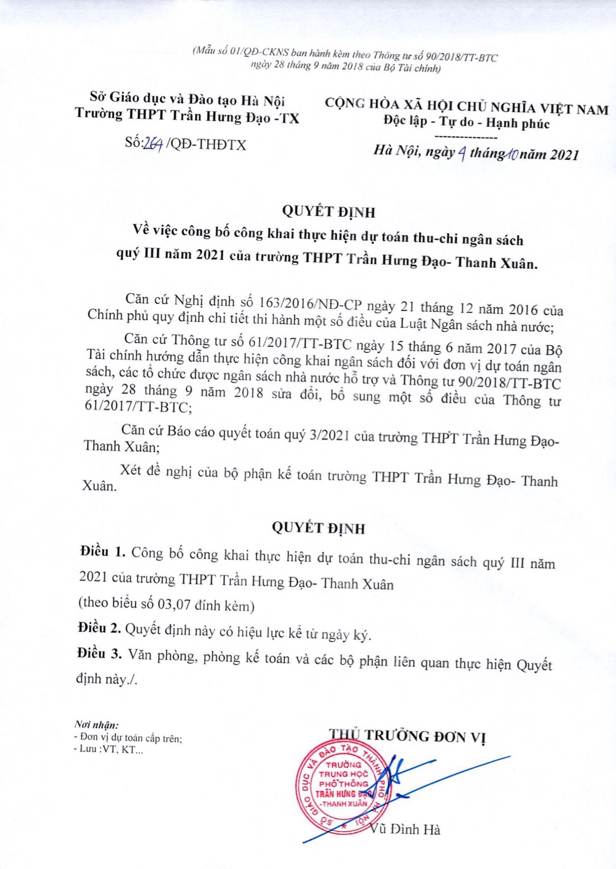Trường THPT Trần Hưng Đạo - Thanh Xuân quyết định công khai dự toán thu-chi ngân sách Quý III năm 2021