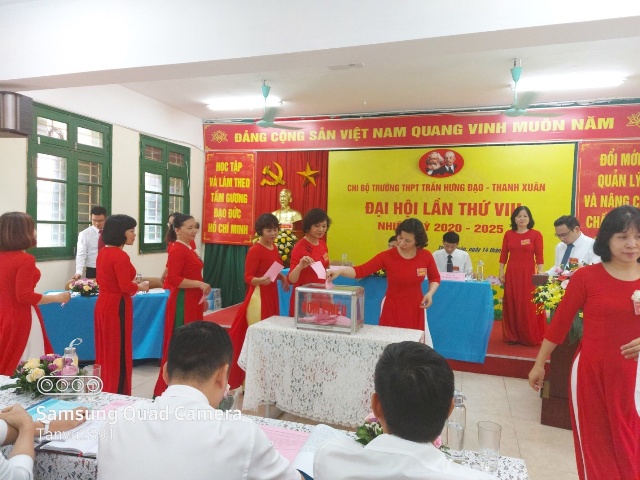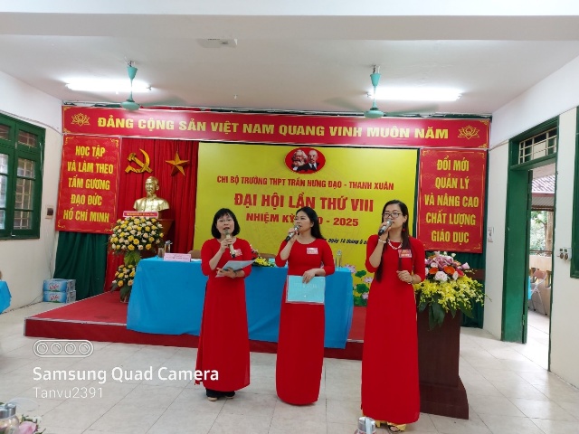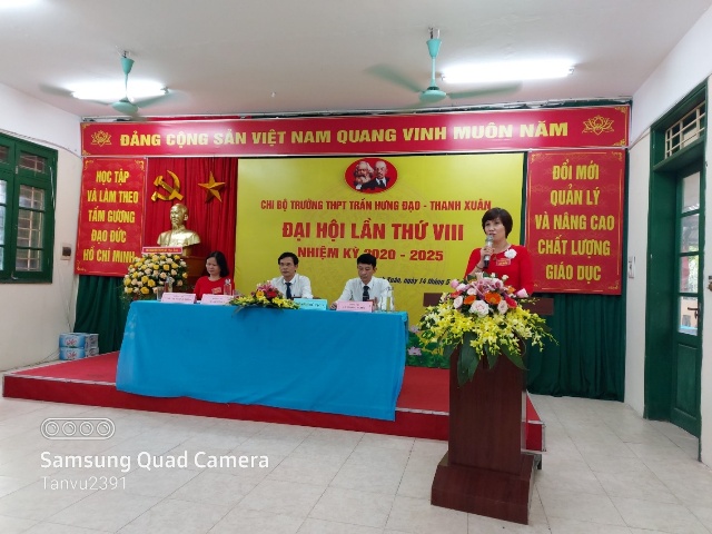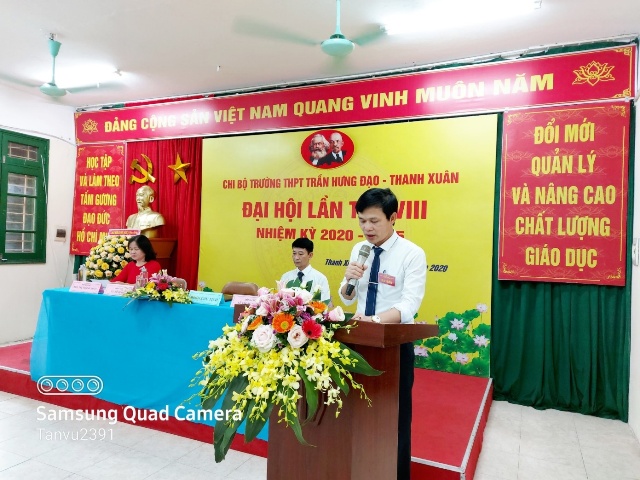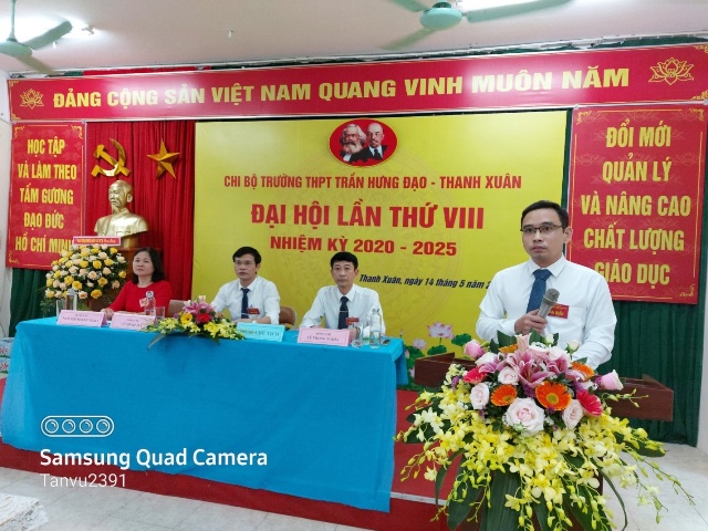 ĐẠI HỘI CHI BỘ TRƯỜNG THPT TRẦN HƯNG ĐẠO - THANH XUÂN LẦN THỨ VIII, NHIỆM KỲ 2020-2025 THÀNH CÔNG TỐT ĐẸP Hòa chung không khí thi đua sôi nổi của toàn Đảng, toàn quân, toàn dân chào mừng Đại hội Đảng bộ các cấp, tiến tới Đại hội đại biểu toàn quốc lần thứ XIII của Đảng. Được sự đồng ý của Quận ủy Thanh Xuân, sáng ngày 14 tháng 5 năm 2020, Chi bộ trường THPT Trần Hưng Đạo - Thanh Xuân đã tổ chức “ĐẠI HỘI CHI BỘ LẦN THỨ VIII - Nhiệm kỳ 2020-2025”. Đại hội vui mừng, phấn khởi được đón tiếp đồng chí: Trần Thị Thu Hà - Phó Trưởng Ban Tổ chức Quận ủy, các đại biểu của Quận ủy Thanh Xuân cùng sự hiện diện của 39 đảng viên trong Chi bộ. Qua một thời gian làm việc nghiêm túc và dân chủ, Đại hội Chi bộ trường THPT Trần Hưng Đạo - Thanh Xuân đã: - Thông qua “Báo cáo tổng kết Chi bộ nhiệm kỳ 2015-2020 và phương hướng hoạt động của Chi bộ nhiệm kỳ 2020 – 2025” - Đại hội đã lựa chọn những đảng viên có đủ phẩm chất, năng lực, tín nhiệm bầu vào Ban Chi ủy Chi bộ, bầu Bí thư, Phó Bí thư để lãnh đạo Chi bộ thực hiện Nghị quyết Đại hội, cụ thể: 1. Đ/c Vũ Đình Hà - Bí thư Chi bộ; 2. Đ/c Ngô Thanh Thảo - Phó Bí thư Chi bộ; 3. Đ/c Nguyễn Quang Minh - Chi uỷ viên. - Đại hội tập trung trí tuệ thảo luận và đóng góp ý kiến cho các dự thảo văn kiện Đại hội Đảng cấp trên. - Đại hội lựa chọn 01 đảng viên có đủ tiêu chuẩn bầu làm đại biểu chính thức, 01 đại biểu dự khuyết đi dự đại hội Đảng bộ quận Thanh Xuân. Đại hội Chi bộ trường THPT Trần Hưng Đạo - Thanh Xuân nhiệm kỳ 2020-2025 kết thúc hồi 11h30 cùng ngày. Nghị quyết đại hội được thông qua là kim chỉ nam cho những hoạt động tiếp theo của tập thể đảng viên, cán bộ, giáo viên, nhân viên và học sinh nhà trường. Tập thể nhà trường sẽ ra sức thi đua dạy tốt - học tốt, phấn đấu để trường THPT Trần Hưng Đạo - Thanh Xuân là điểm sáng trong ngành giáo dục Thủ đô./. Một số hình ảnh của Đại hội:
