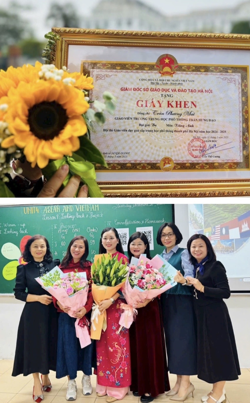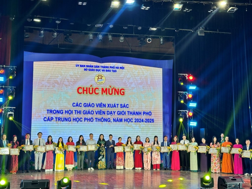 TIN VUI TỪ HỘI THI GIÁO VIÊN DẠY GIỎI CẤP THÀNH PHỐ Sáng 4/4, tại trường THPT chuyên Hà Nội - Amsterdam, Sở Giáo dục và Đào tạo Hà Nội tổ chức tổng kết, khen thưởng Hội thi giáo viên dạy giỏi cấp THPT các môn Toán, Tiếng Anh, Công nghệ năm học 2024 - 2025. Hội thi giáo viên dạy giỏi cấp THPT năm nay được tổ chức tại 16 điểm thi thuộc 16 cụm trường THPT từ ngày 11/2 đến 4/3 với sự tham gia của 105 giáo viên. Đây là những nhà giáo xuất sắc nhất được lựa chọn từ 5.000 giáo viên giỏi ở cấp trường, 1.500 giáo viên giỏi cấp cụm. Vinh dự và tự hào khi trường THPT Trần Hưng Đạo – Thanh Xuân có 02 cô giáo được đứng trên bục danh dự để nhận trao thưởng từ lãnh đạo Sở Giáo dục và Đào tạo Hà Nội. Cụ thể như sau: - Cô giáo Nguyễn Thị Thanh Hà đạt giải Nhì môn Công nghệ Nông Nghiệp. - Cô giáo Trần Phương Mai đạt giải Ba môn Tiếng Anh.