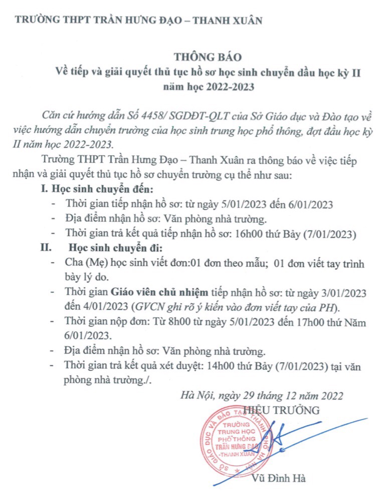Trường THPT Trần Hưng Đạo – Thanh Xuân thông báo về việc tiếp nhận và giải quyết thủ tục hồ sơ chuyển trường đầu học kỳ II