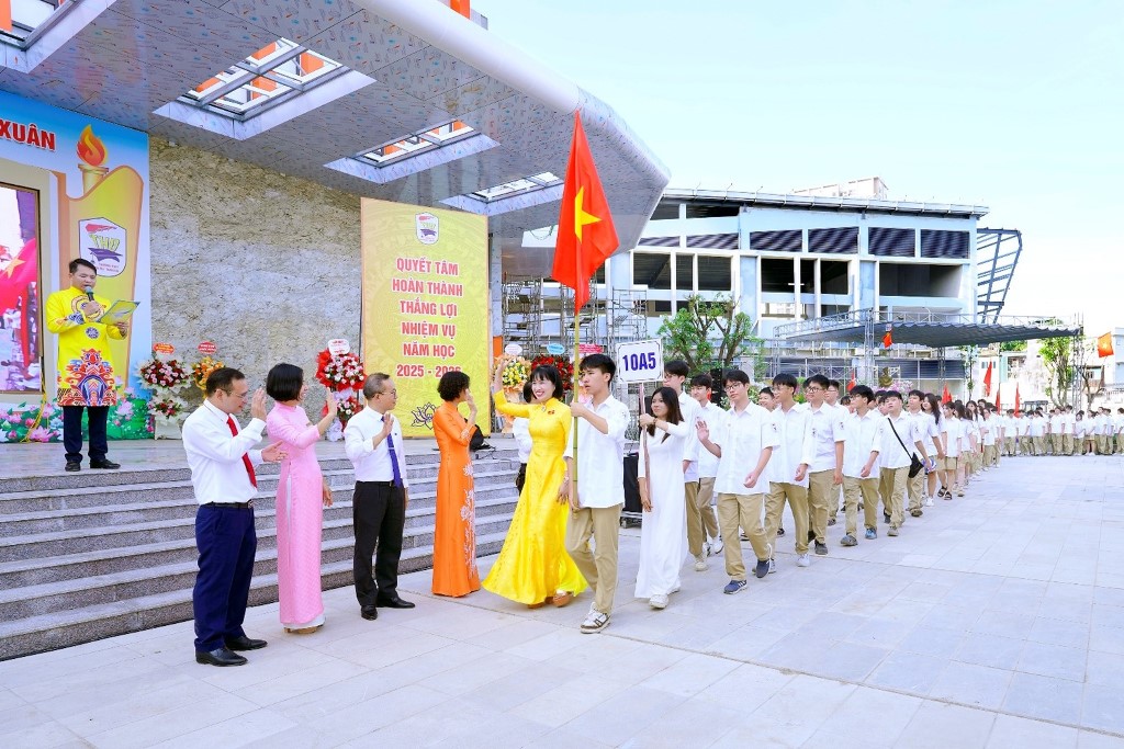 Lễ đón 770 học sinh lớp 10 được tổ chức ấm áp, đầy thân tình, đánh dấu bước khởi đầu quan trọng trong chặng đường học tập của các em tại mái trường THPT Trần Hưng Đạo - Thanh Xuân. Tiếp đó, Nhà giáo Vũ Đình Hà – Bí thư Chi bộ, Hiệu trưởng nhà trường đọc diễn văn Khai giảng, khẳng định quyết tâm của tập thể sư phạm và học sinh trong năm học mới, đồng thời long trọng đánh trống khai trường, mở ra một hành trình mới đầy hứng khởi. Cũng trong buổi lễ, nhà trường đã tổ chức khen thưởng các thầy cô giáo khối 12 có nhiều thành tích xuất sắc trong công tác giảng dạy, đồng thời vinh danh các em học sinh đạt kết quả cao trong Kỳ thi Tốt nghiệp THPT Quốc gia vừa qua và những học sinh có điểm thi nổi bật trong kỳ thi tuyển sinh vào lớp 10. Đây chính là những bông hoa tươi thắm, tô điểm thêm bảng vàng thành tích của nhà trường.
