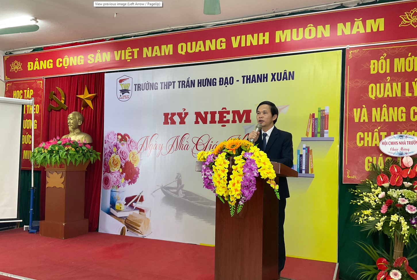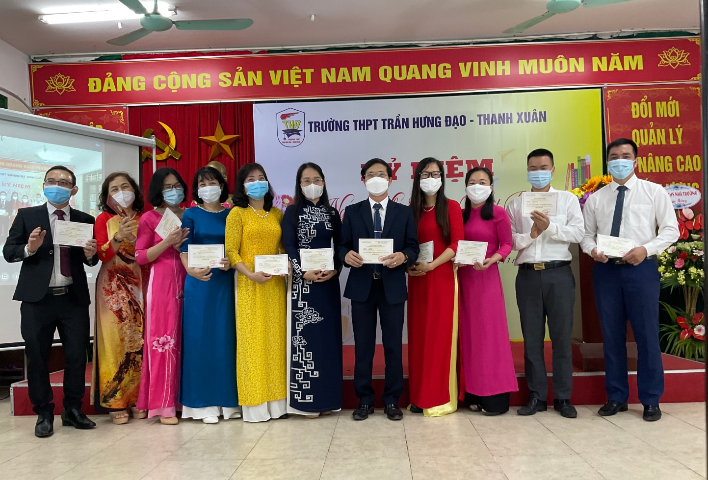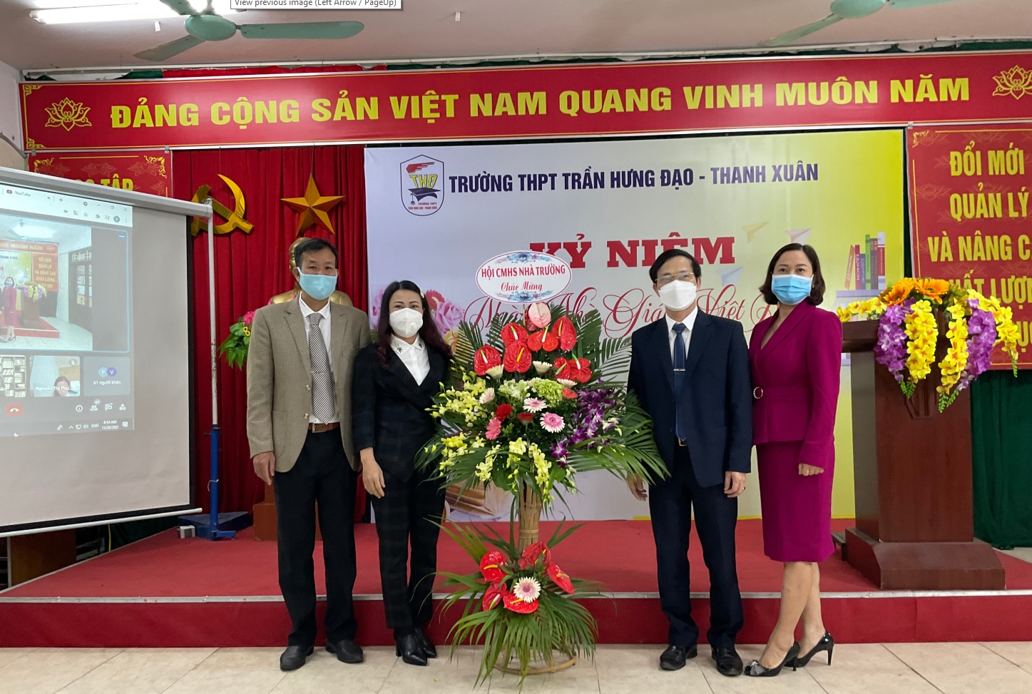 TRƯỜNG THPT TRẦN HƯNG ĐẠO - THANH XUÂN Trong không khí vui tươi, ấm áp, thầy và trò trường THPT Trần Hưng Đạo – Thanh Xuân đã trang trọng tổ chức Lễ kỉ niệm 39 năm ngày Nhà giáo Việt Nam (20/11/1982 - 20/11/2021) Để đảm bảo an toàn phòng chống dịch và tạo sức lan tỏa, buổi lễ được tổ chức dưới hình thức kết hợp cả trực tuyến và trực tiếp. Từ phòng họp nhà trường, chương trình được kết nối đến các cán bộ, giáo viên, nhân viên, toàn thể học sinh và cha mẹ học sinh nhà trường. Mở đầu chương trình, nhà giáo Vũ Đình Hà – Bí thư Chi bộ – Hiệu trưởng nhà trường ôn lại truyền thống tôn sự trọng đạo của các thế hệ học sinh nhà trường, tôn vinh các thế hệ giáo viên đã chung sức, đồng lòng xây dựng và phát triển nhà trường ngày càng lớn mạnh như ngày nay. Trong diễn văn tại buổi lễ, thầy giáo Vũ Đình Hà nhấn mạnh: Năm học vừa qua, trước diễn biến phức tạp của đại dịch Covid- 19, tập thể cán bộ, giáo viên, nhân viên cùng học sinh nhà trường đã cố gắng vươn lên, chủ động, sáng tạo thực hiện thành công “mục tiêu kép” vừa phòng chống dịch vừa tổ chức dạy tốt, học tốt. Thầy và trò nhà trường gửi lời cảm ơn sâu sắc đến các cơ quan, đơn vị, tổ chức, cá nhân, các bậc Cha mẹ học sinh đã quan tâm giúp đỡ tạo điều kiện cho nhà trường hoàn thành tốt nhiệm vụ năm học 2020-2021.