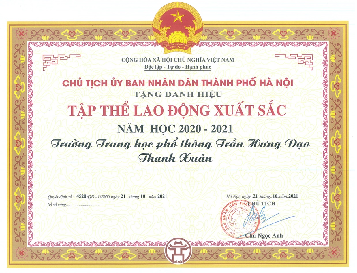 Với những nỗ lực không ngừng, năm qua, Trường THPT Trần Hưng Đạp – Thanh Xuân tiếp tục khẳng định vị trí dẫn đầu về chất lượng dạy và học trong ngành giáo dục Thủ đô. Tập thể nhà trường vinh dự được đón nhận danh hiệu thi đua “Tập thể lao động xuất sắc”, Tổ Ngữ Văn – Lịch sử – Giáo dục công dân được trao danh hiệu “Tập thể Lao động Tiên tiến”, Công đoàn nhà trường được công nhận là “Hoàn thành xuất sắc nhiệm vụ” cấp thành phố; 14 thầy cô giáo được Sở GDĐT Hà Nội công nhận là “Chiến sĩ thi đua cấp cơ sở”. Đặc biệt hơn nữa, trong tháng 11 này, cô giáo Lê Thị Mười – giáo viên Lịch sử đang công tác tại nhà trường được Chủ tịch nước trao tặng danh hiệu “Nhà giáo Ưu tú”.