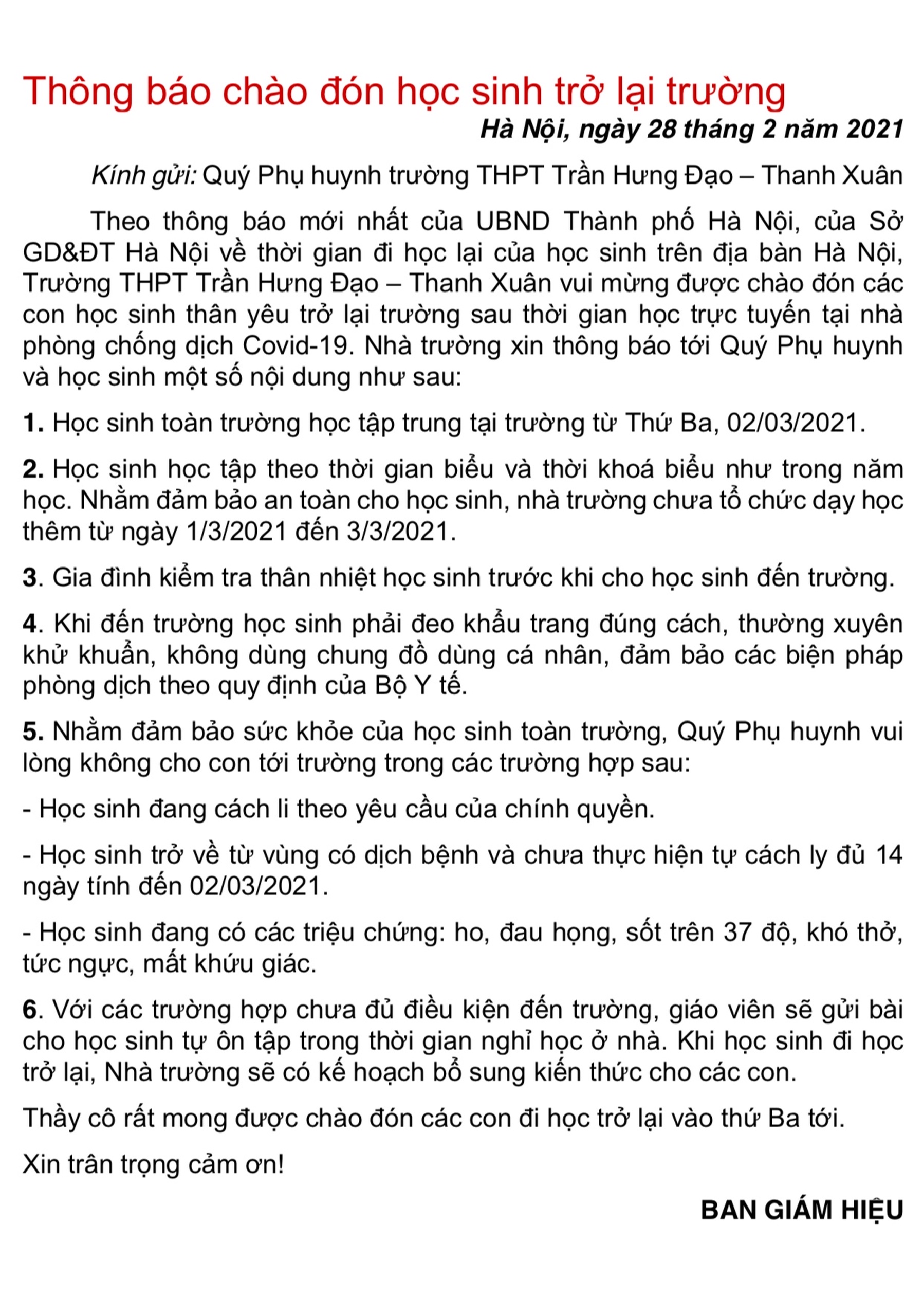 TRƯỜNG THPT TRẦN HƯNG ĐẠO, THANH XUÂN LONG TRỌNG TỔ CHỨC LỄ KHAI GIẢNG NĂM HỌC 2020 - 2021