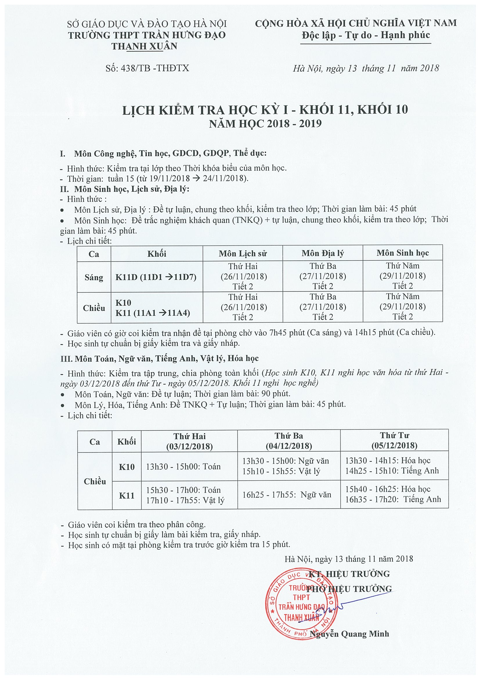 LỊCH KIỂM TRA HỌC KỲ I - KHỐI 10, KHỐI 11 năm học 2019 -2020