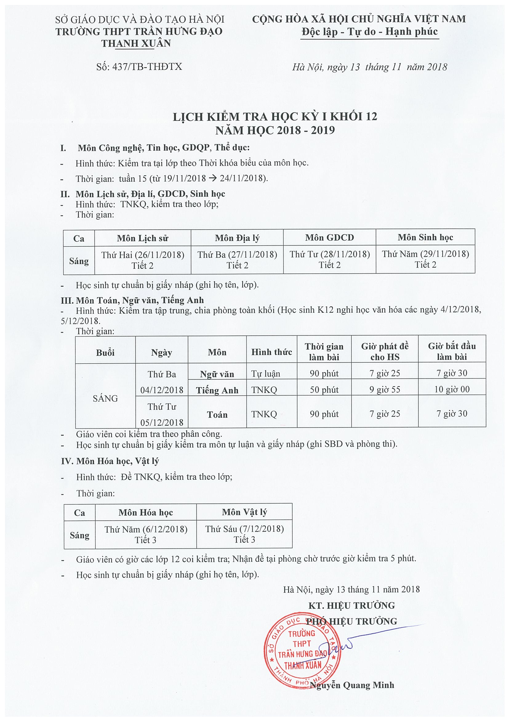 LỊCH KIỂM TRA HỌC KỲ I - KHỐI 12 năm học 2018 -2019