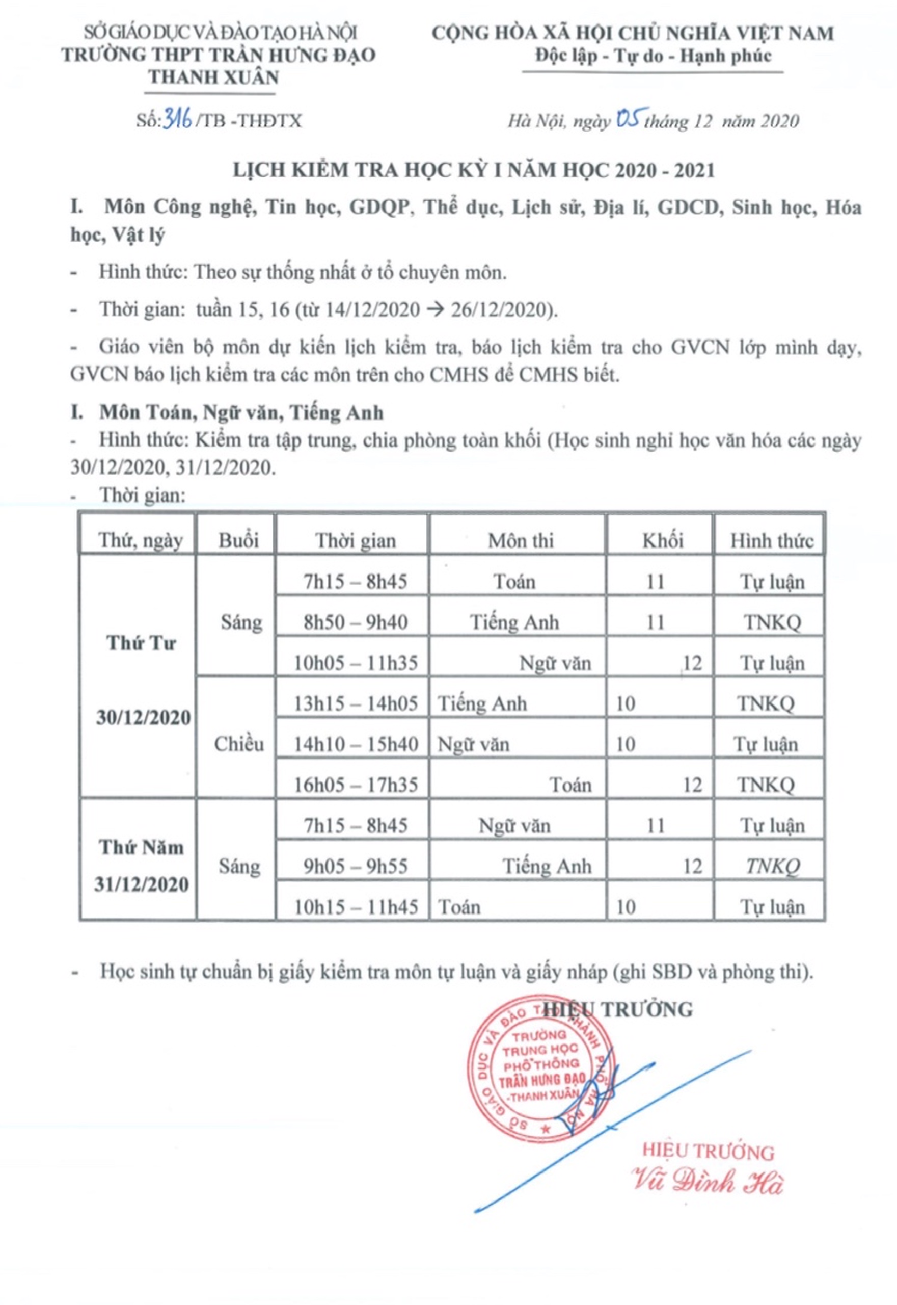 LỊCH KIỂM TRA HỌC KỲ I - KHỐI 10, KHỐI 11 năm học 2019 -2020
