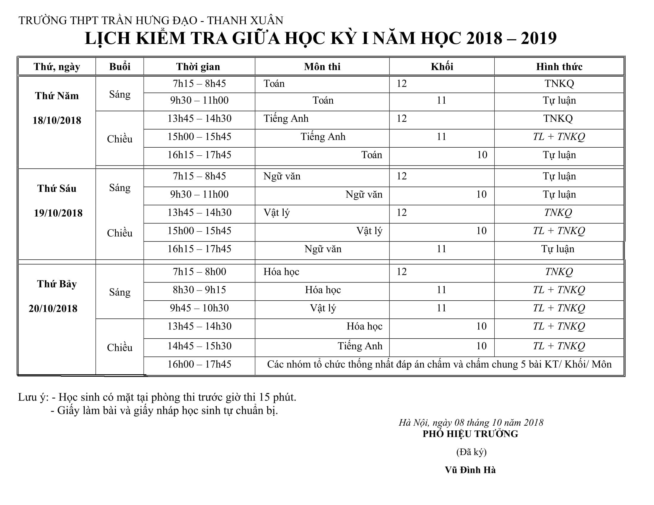 LỊCH KIỂM TRA HỌC KỲ I - KHỐI 10, KHỐI 11 năm học 2018 -2019