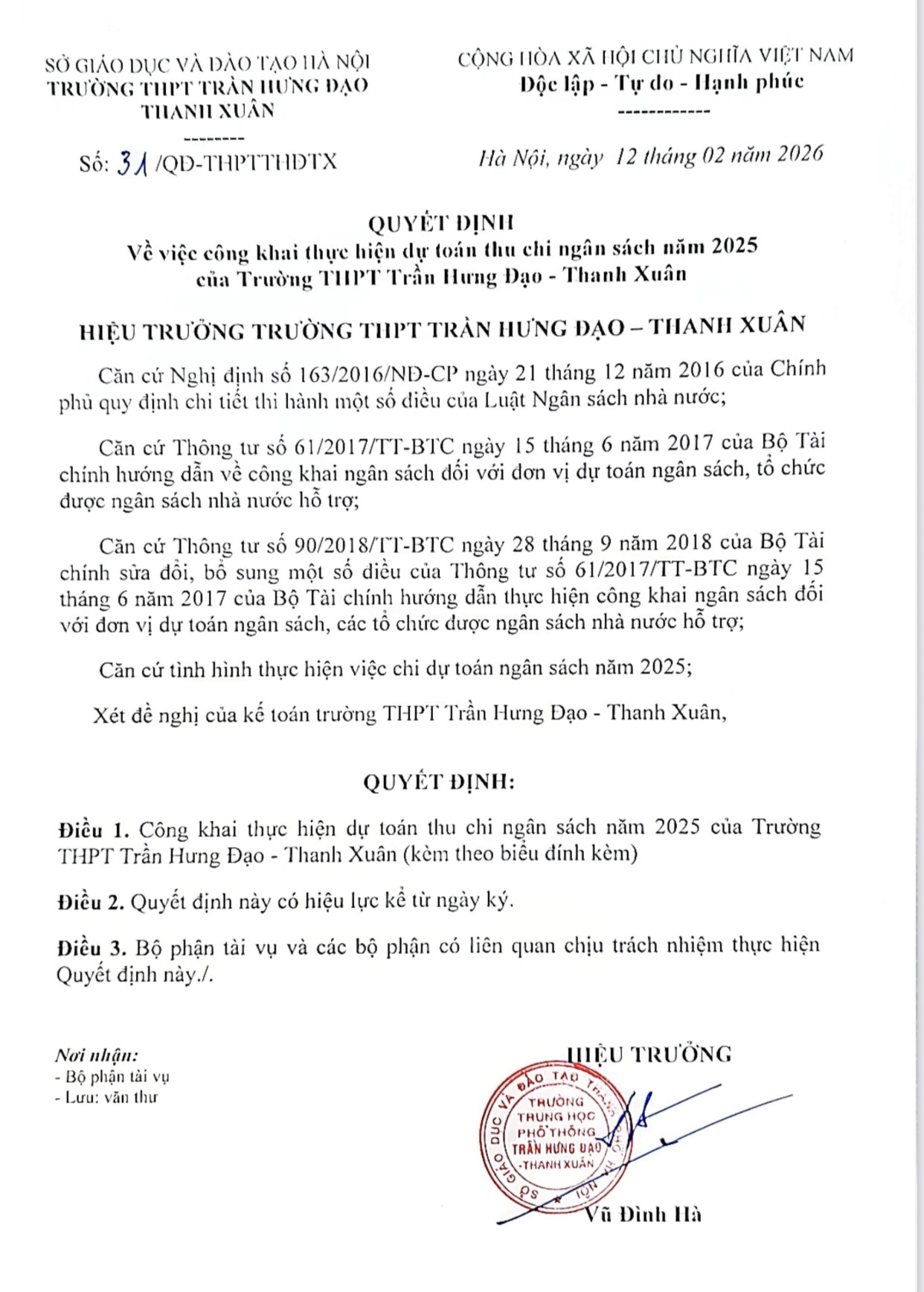 QUYẾT ĐỊNH: Công khai dự toán chi ngân sách nhà nước năm 2026 của Trường THPT Trần Hưng Đạo - Thanh Xuân