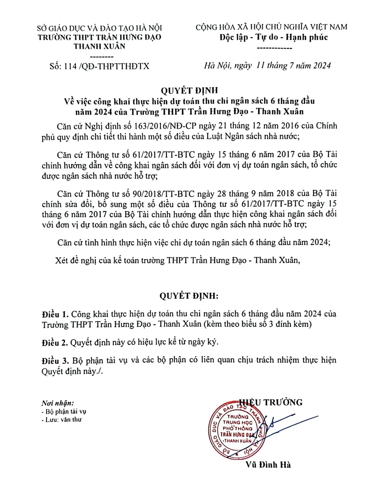 QUYẾT ĐỊNH: Về việc công khai dự toán thu chi ngân sách Quư III năm 2024 của Trường THPT Trần Hưng Đạo - Thanh Xuân