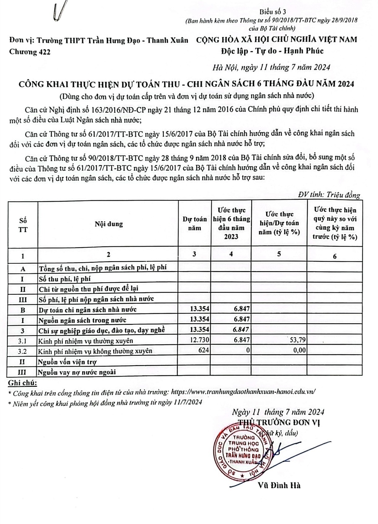 Quyết Định: Về việc công khai thực hiện dự toán thu, chi ngân sách 6 tháng đầu năm 2023 của Trường THPT Trần Hưng Đạo - Thanh Xuân