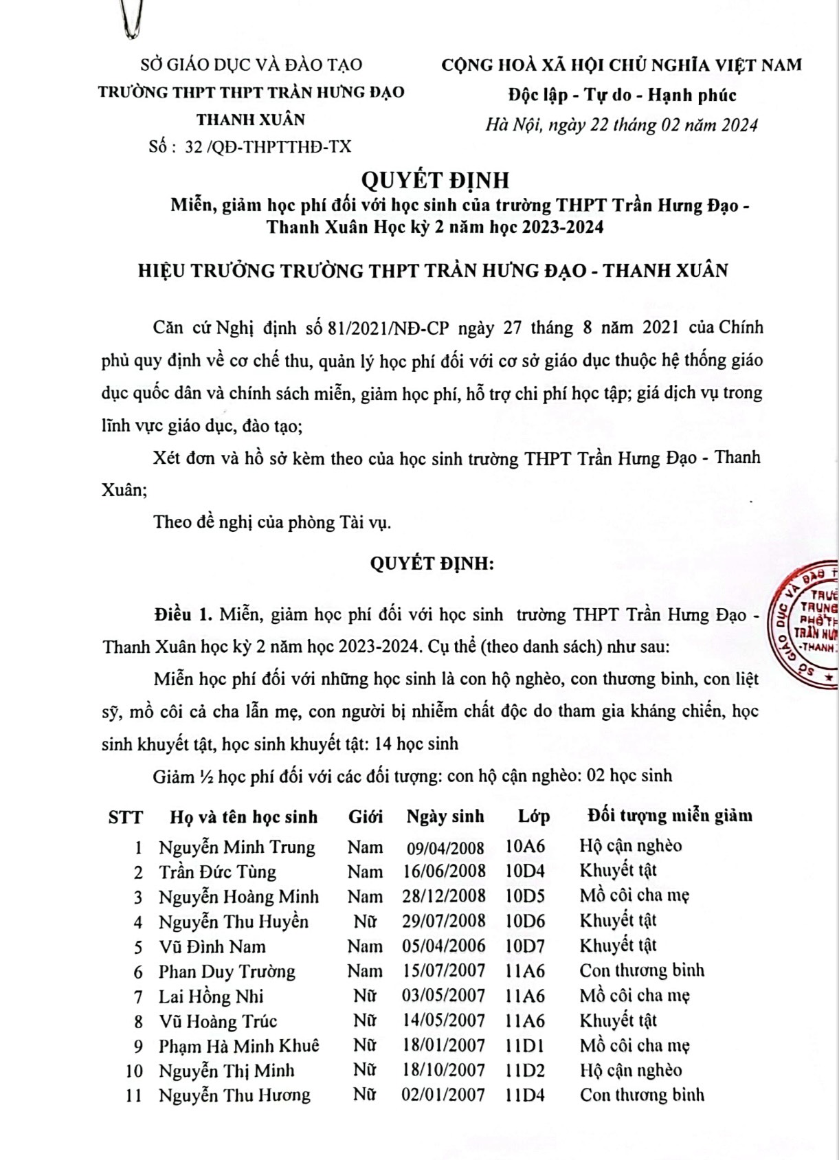 QUYẾT ĐỊNH: Về việc công khai dự toán thu chi ngân sách 6 tháng đầu năm 2024 của Trường THPT Trần Hưng Đạo - Thanh Xuân