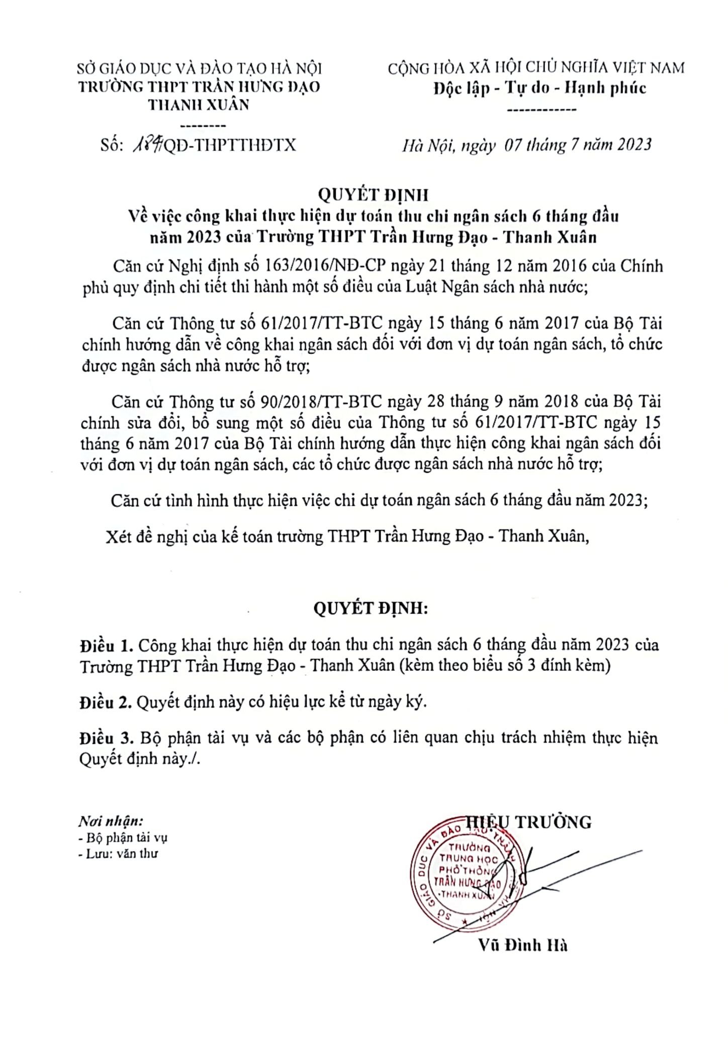 QUYẾT ĐỊNH: Về việc công khai quyết toán ngân sách năm 2023 của Trường THPT Trần Hưng Đạo - Thanh Xuân