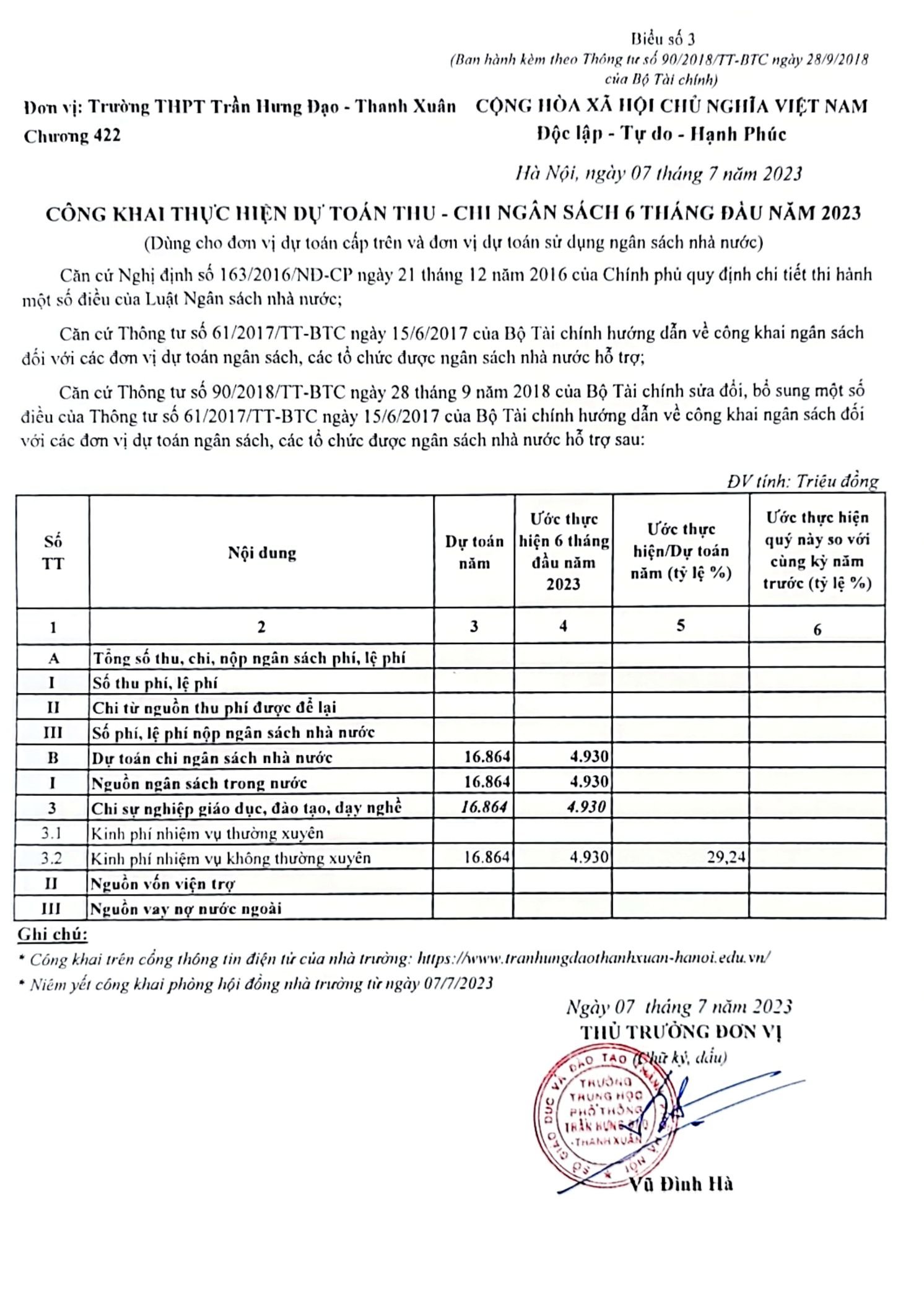QUYẾT ĐỊNH: Về việc công khai dự toán thu chi ngân sách 6 tháng đầu năm 2024 của Trường THPT Trần Hưng Đạo - Thanh Xuân