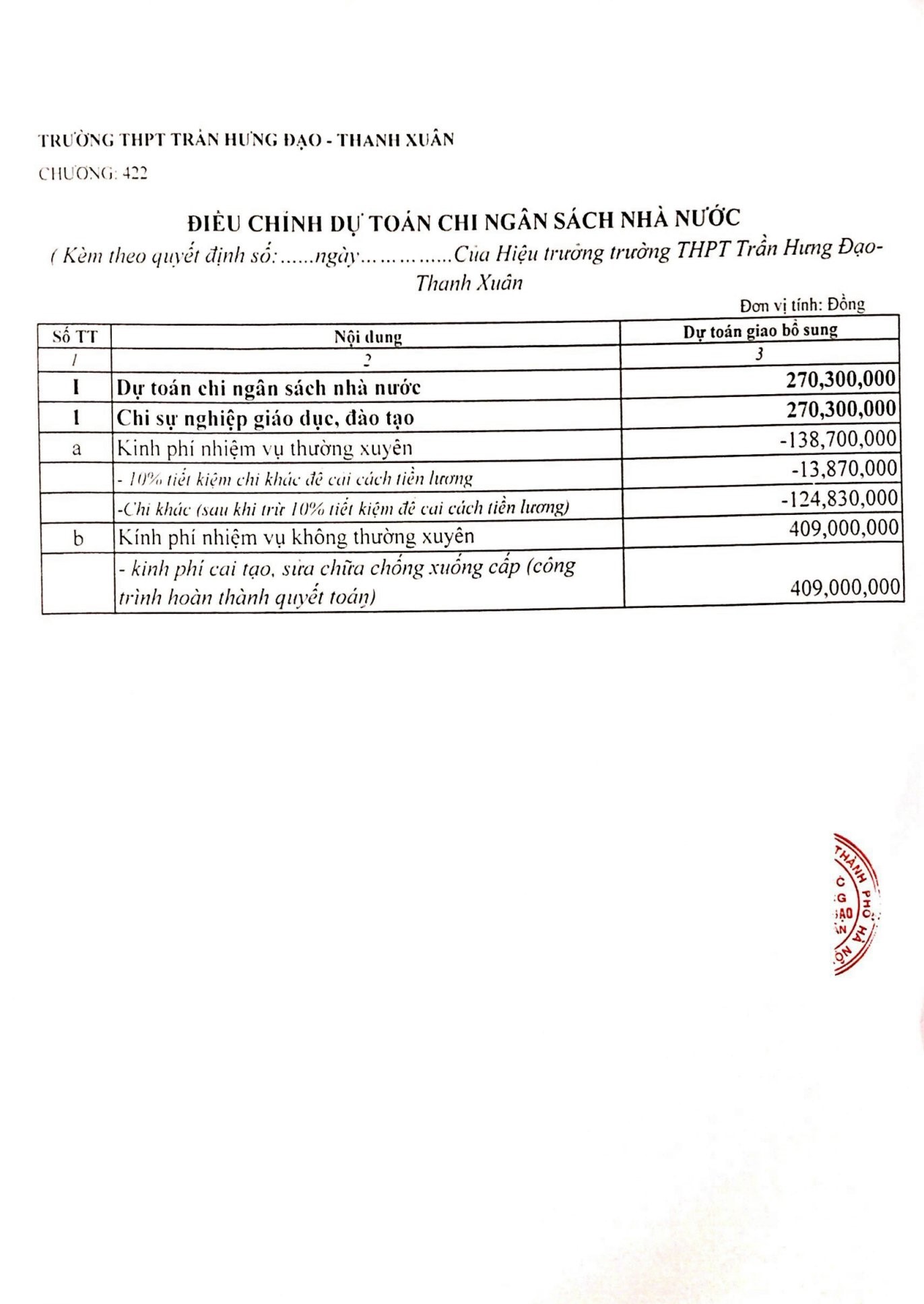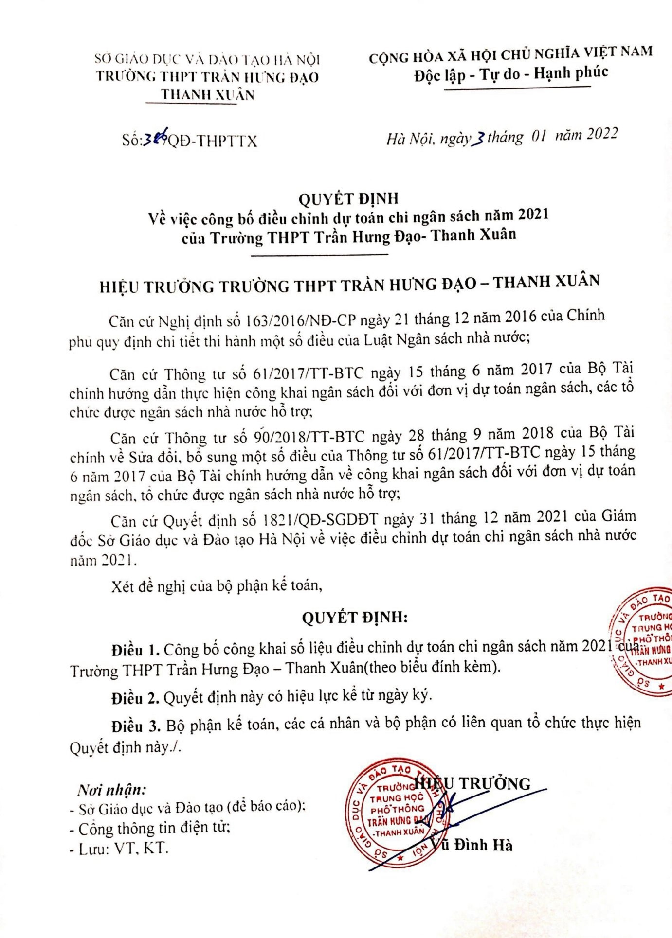 Quyết Định về việc công bố công khai giao bổ sung dự toán chi ngân sách năm 2021 của Trường THPT Trần Hưng Đạo - Thanh Xuân