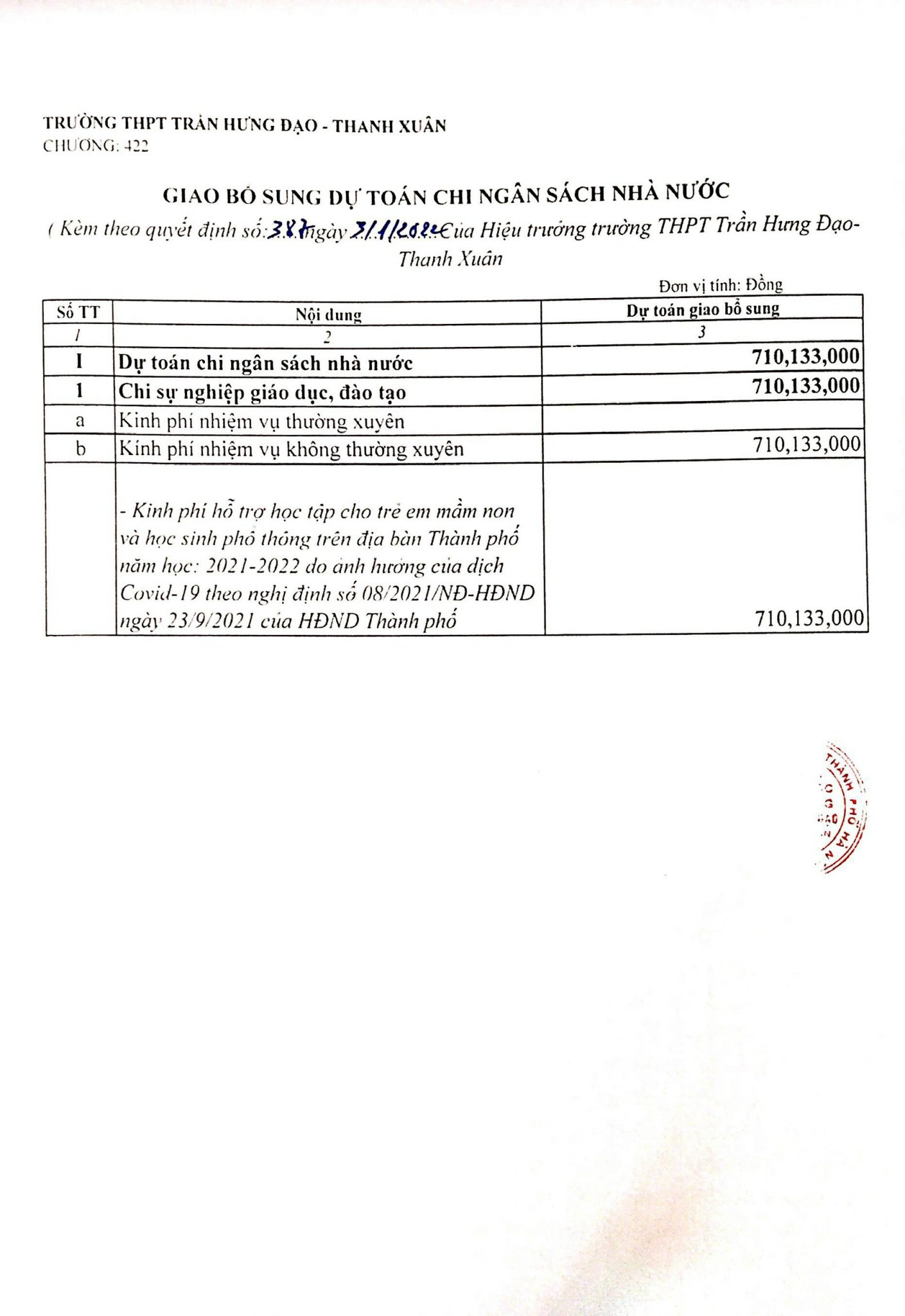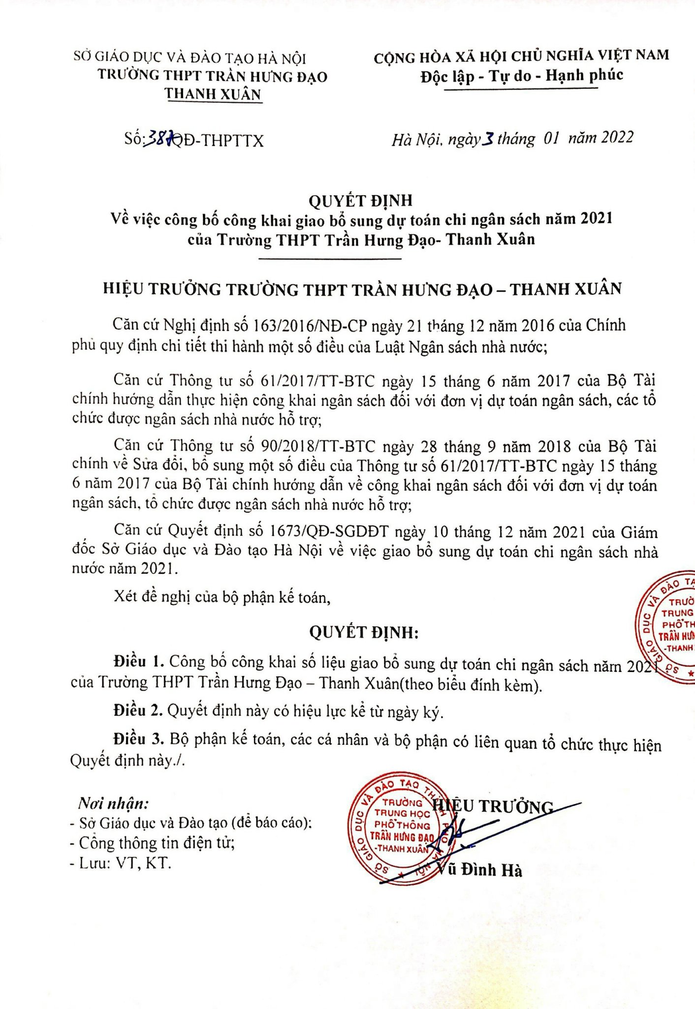 Quyết Định về việc công bố điều chỉnh dự toán chi ngân sách năm 2021 của Trường THPT Trần Hưng Đạo - Thanh Xuân