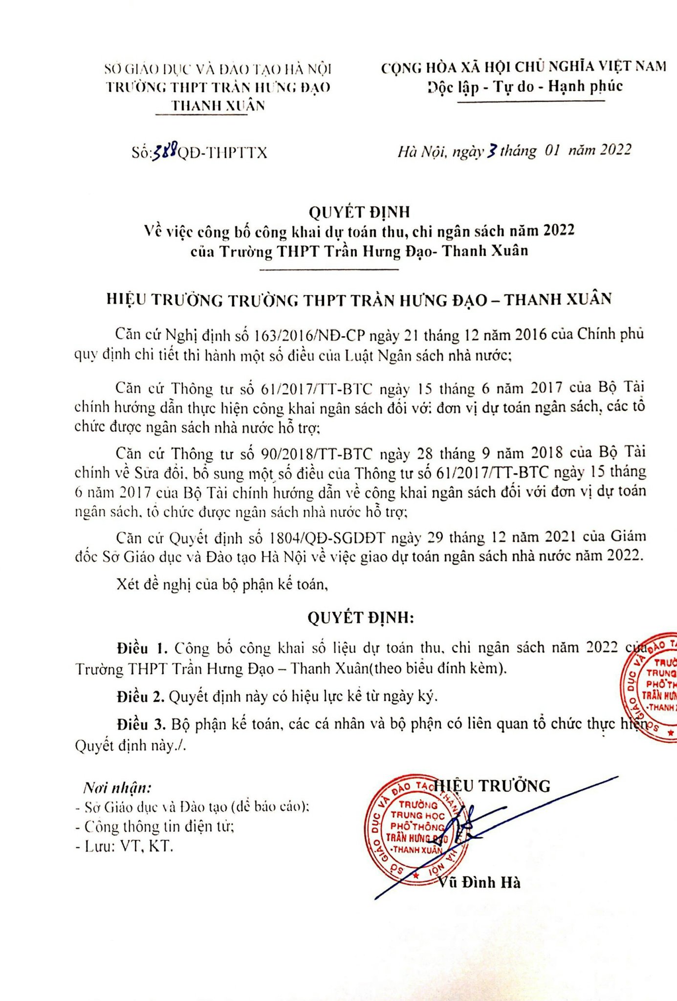 Quyết Định: Về việc công khai quyết toán ngân sách năm 2022 của Trường THPT Trần Hưng Đạo - Thanh Xuân