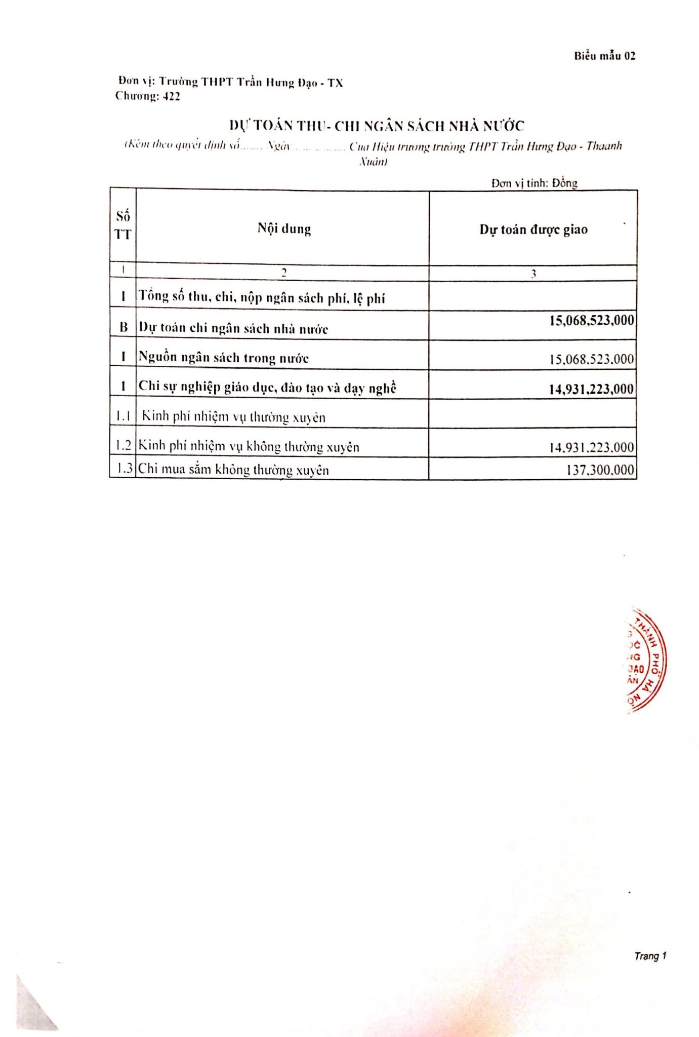 QUYẾT ĐỊNH: Về việc công khai dự toán thu chi ngân sách Quư I năm 2024 của Trường THPT Trần Hưng Đạo - Thanh Xuân
