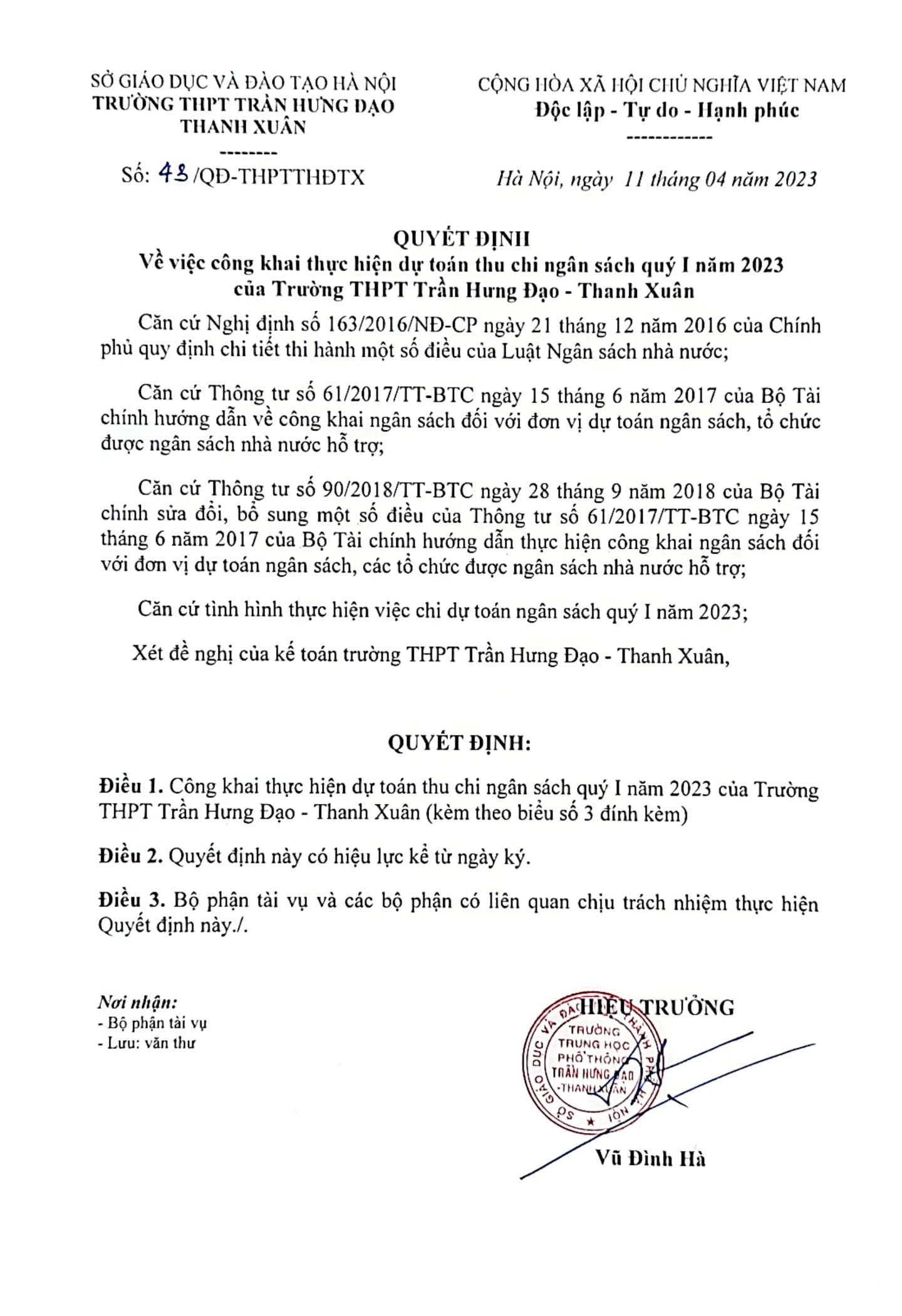 QUYẾT ĐỊNH: Về việc công khai dự toán thu chi ngân sách Quư I năm 2024 của Trường THPT Trần Hưng Đạo - Thanh Xuân