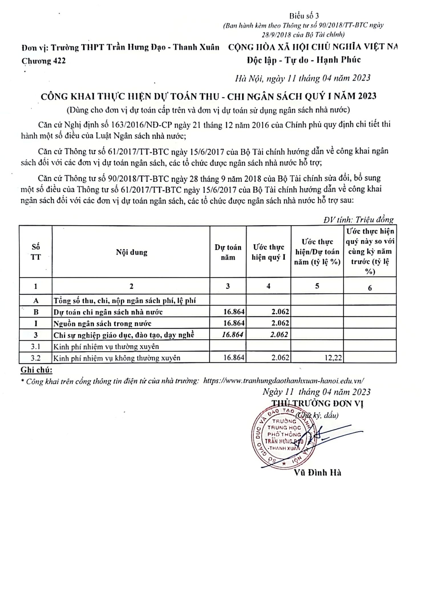Quyết Định: Về việc công khai thực hiện dự toán thu, chi ngân sách 6 tháng đầu năm 2023 của Trường THPT Trần Hưng Đạo - Thanh Xuân