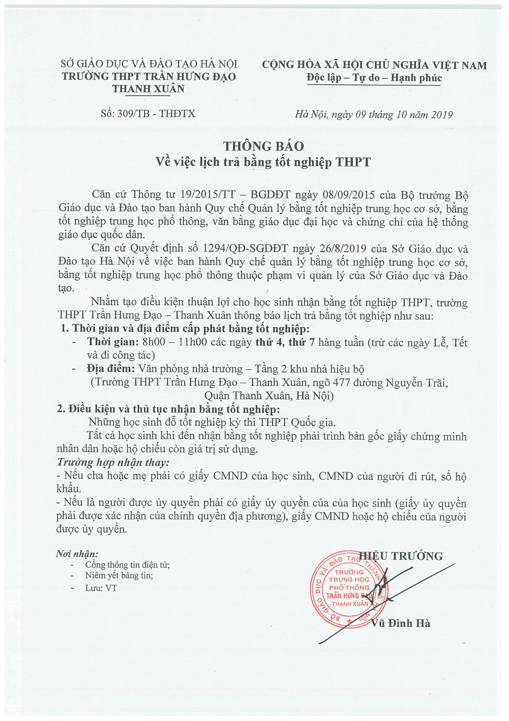 QUYẾT ĐỊNH: Miễn, giảm học phí đối với học sinh của trường THPT Trần Hưng Đạo - Thanh Xuân trong học kỳ 2 năm học 2023 - 2024