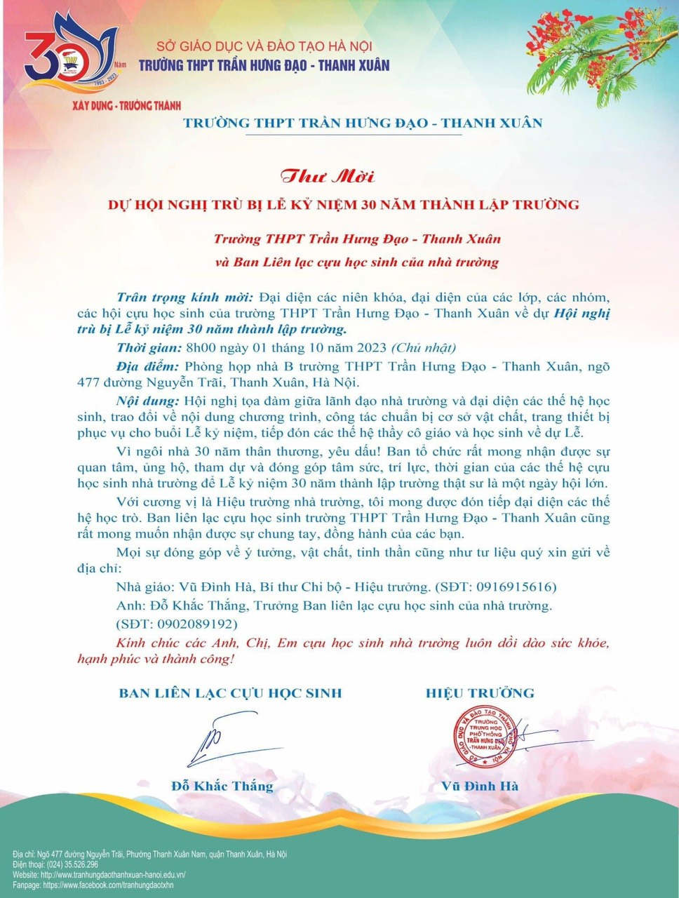 GIẤY MỜI DỰ LỄ KỶ NIỆM 30 NĂM THÀNH LẬP TRƯỜNG THPT TRẦN HƯNG ĐẠO - THANH XUÂN (1993 - 2023)