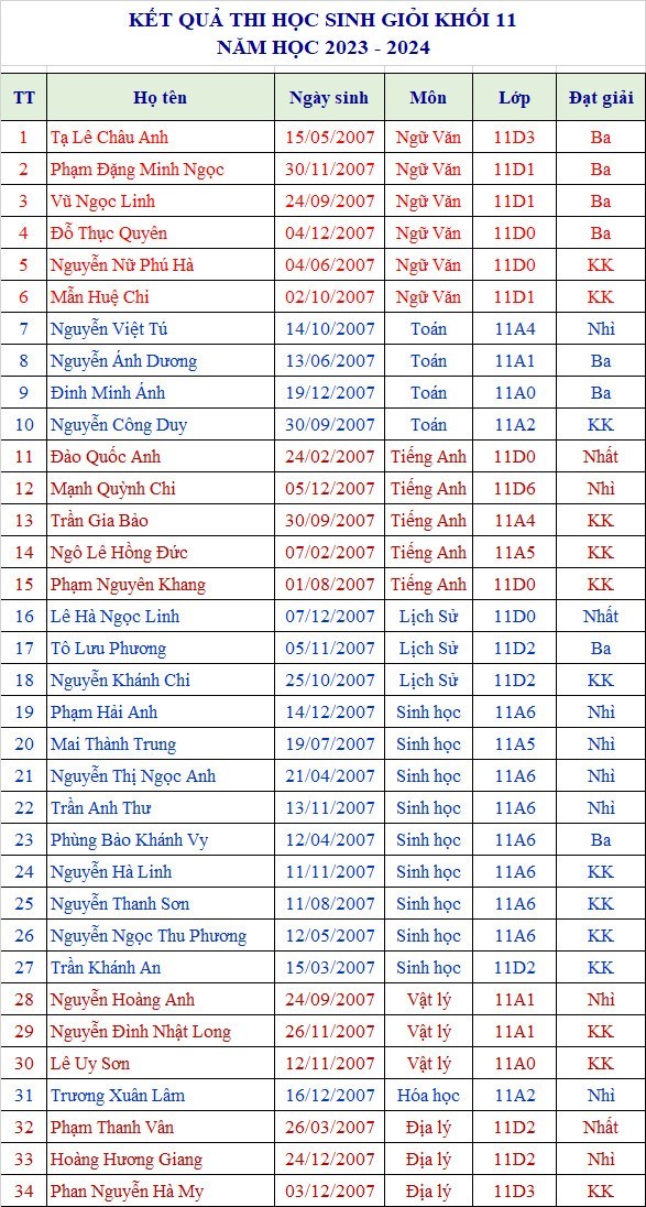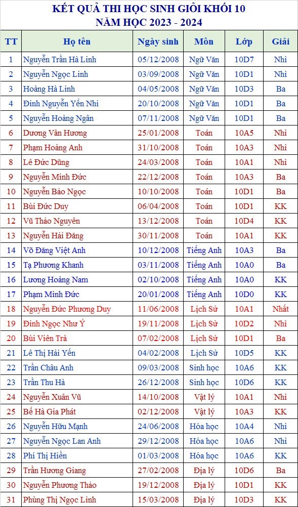 Danh sách học sinh đoạt giải học sinh giỏi cấp cụm